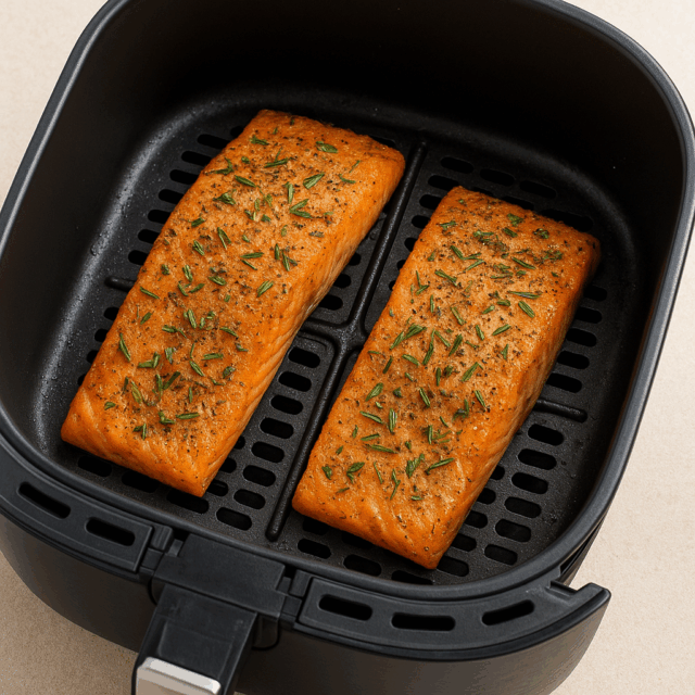 Herb-crusted salmon features tender salmon fillets brushed with olive oil and seasoned with rosemary, thyme, and garlic powder. The fillets are air-fried at 200 C for 10-12 minutes, achieving a crispy outside and juicy inside. A squeeze of lemon adds a refreshing finish.